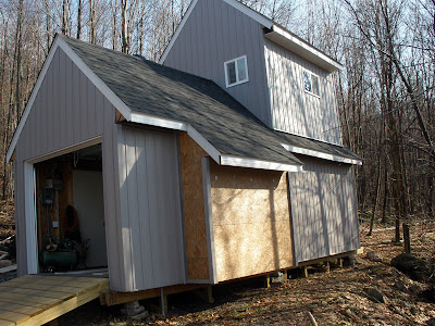 It was supposed to be a cloudy day but it was a bright sunny day without a cloud in the sky all day. The temperature reached the high 50's and we had another great day of work.We worked on siding the other side of the tractor barn and got this much done before lunch. Just have to finish the bump out and the lower back.