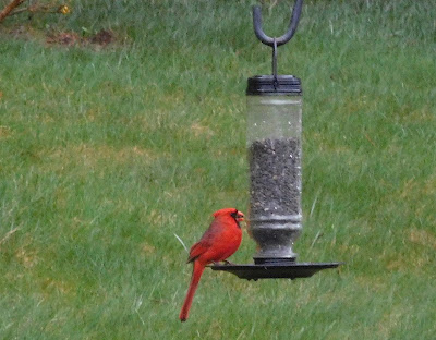 When I got home and walked around back I was happy to see a cardinal having breakfast at the feeder. Picture not very good because I really had to zoom in to get him and he flew off a second later.